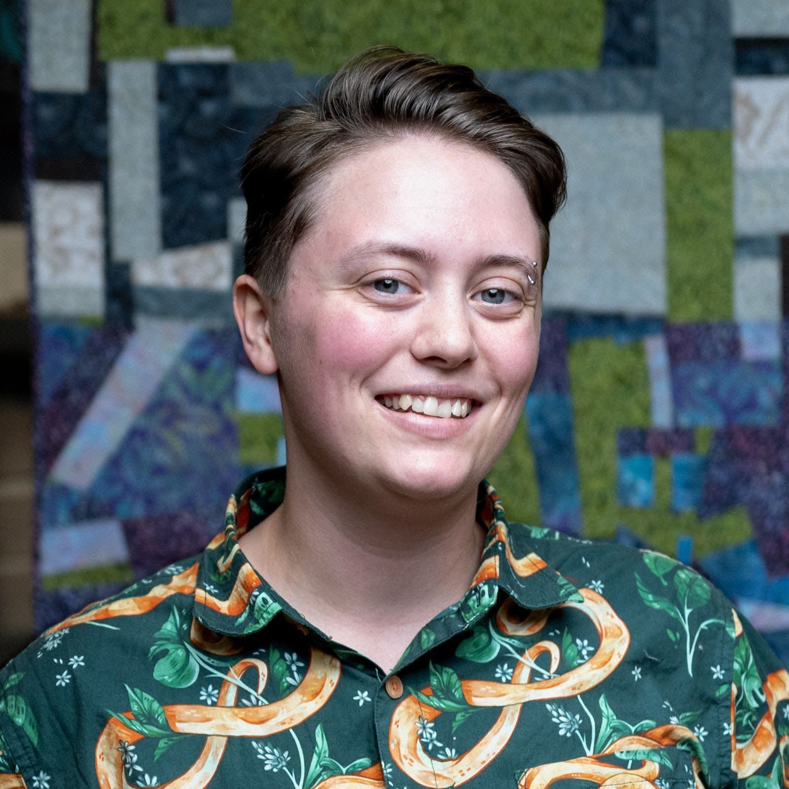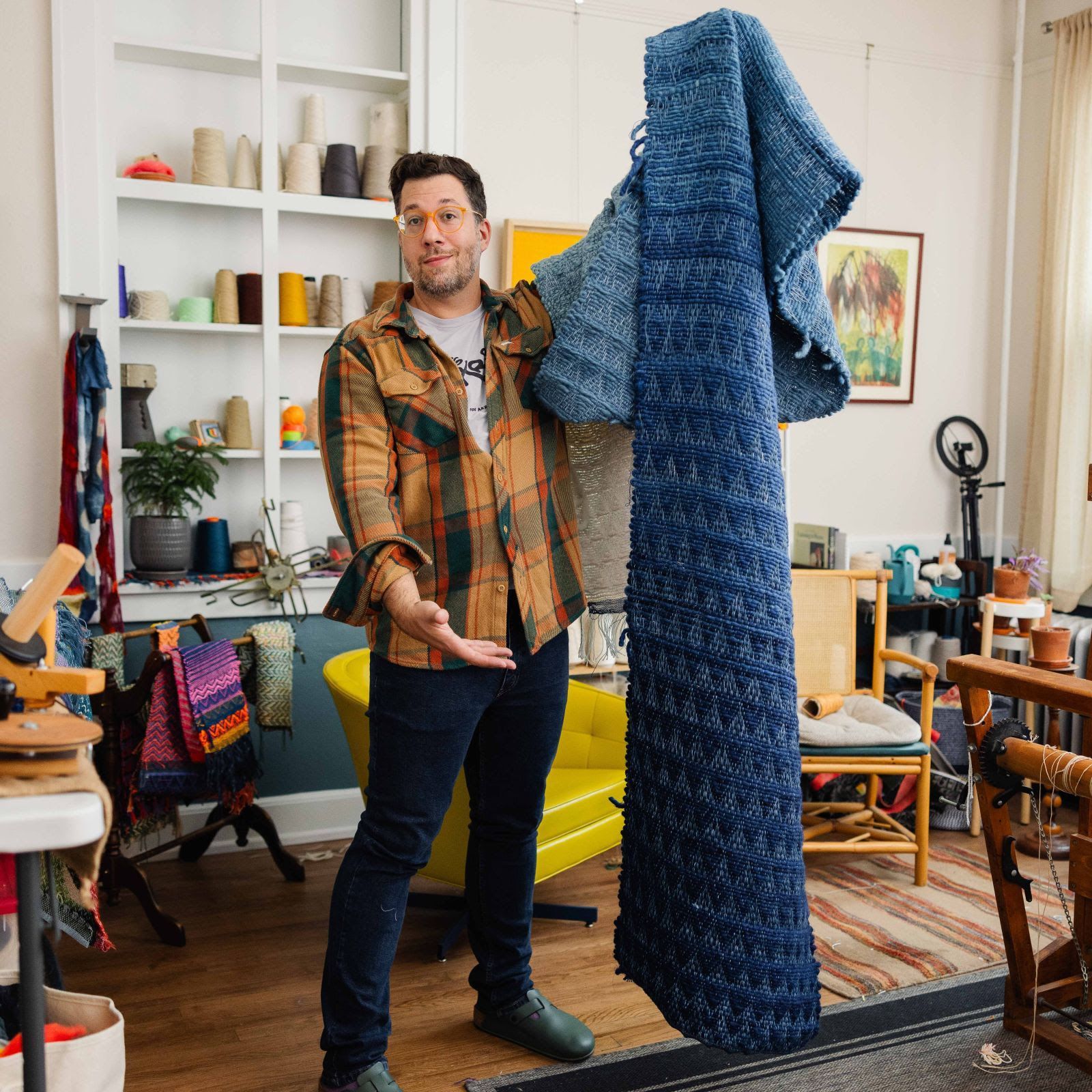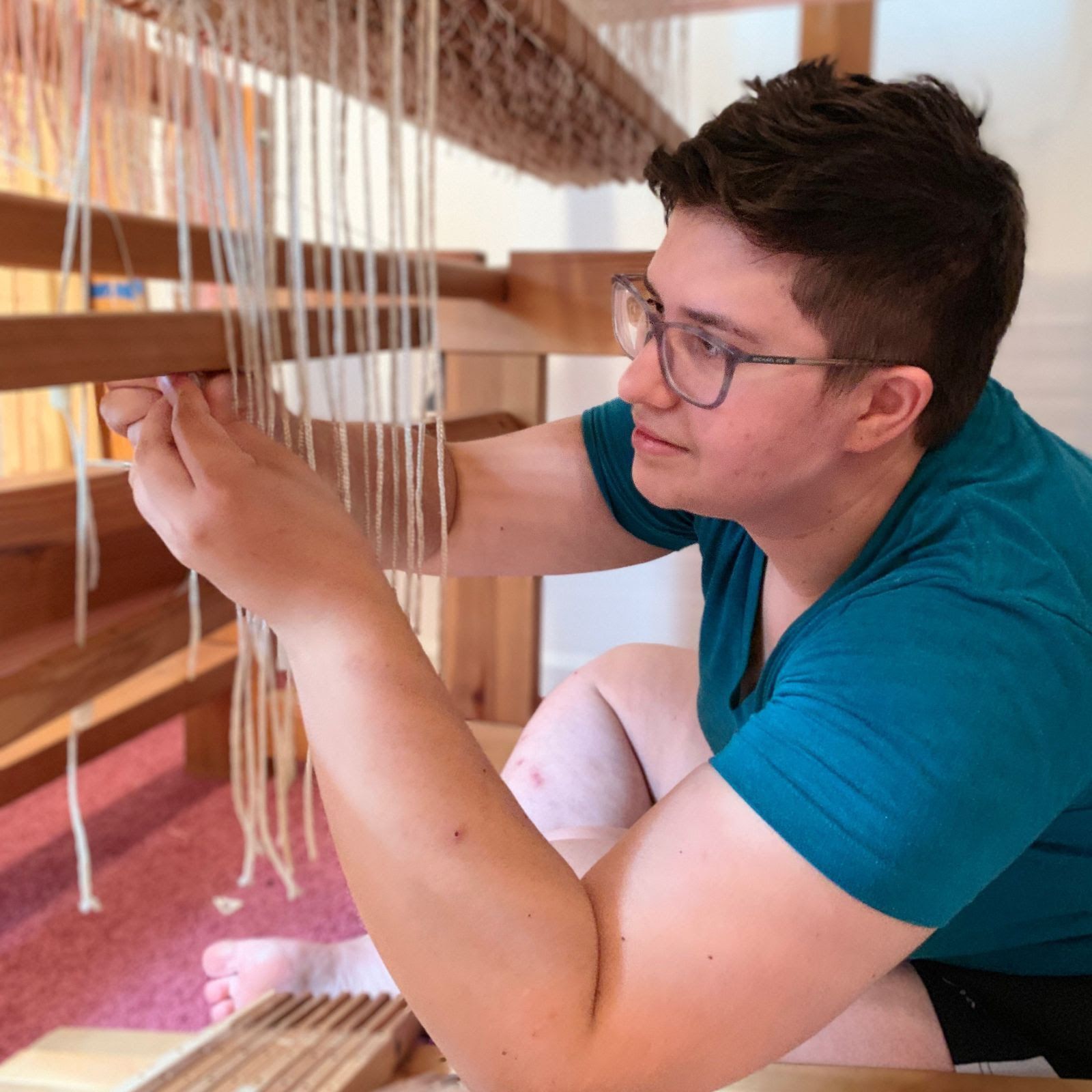 Emerson Croft is a craftsperson and educator based in Berea, Kentucky. They hold a B.A. from Berea College, where they studied biology and sociology. Their background in the natural and social sciences informs their personal work, which centers on themes of community, human nature, and humor. Croft serves as the Weaving Manager at Berea College Student Craft, supervising a production studio staffed by undergraduate students. Primarily a fiber artist, their practice focuses on weaving and quilting, with additional interests in woodworking, bookbinding, and songwriting, which they incorporate into their work whenever possible.